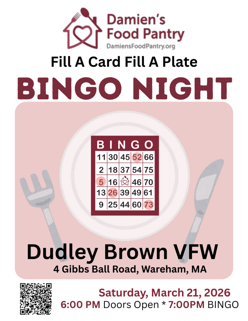 Taking place on Saturday, March 21, 2026, at the Dudley Brown VFW, 4 Gibbs Ball Park Rd., Wareham, MA, this one-of-a-kind bingo night supports Damien’s Place, helping ensure that no one in our community goes to bed hungry. Every card played and every ticket purchased directly supports meals for individuals and families in need.